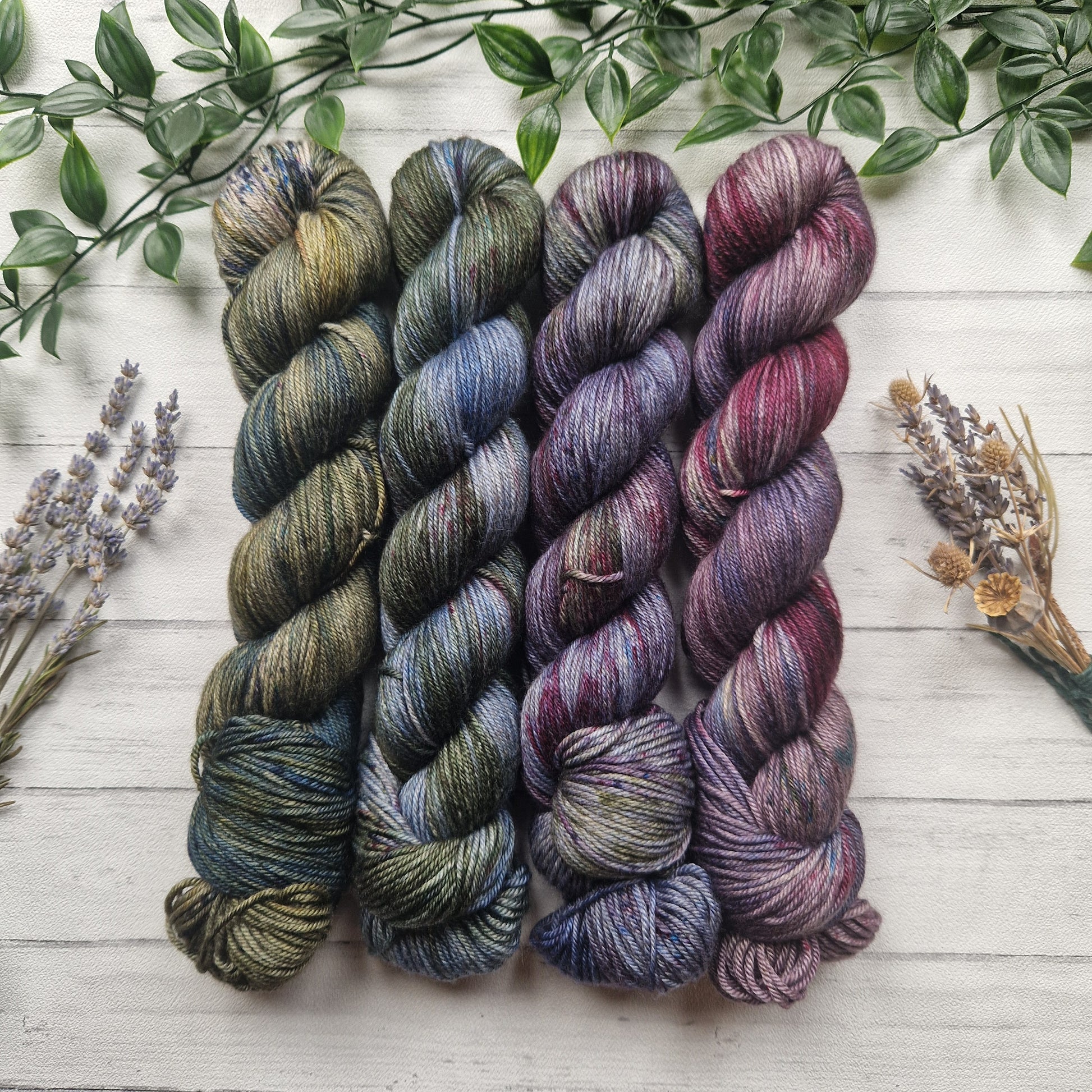 Please note that each skein of yarn is hand-dyed, resulting in unique variations between them. We suggest alternating skeins throughout your project to create a more uniform look. If you purchase multiple skeins of the same colourway, they will be from the same dye-lot unless otherwise specified. We take great care to ensure consistency between dye-lots, but as with all hand-dyed yarn, some variations may occur.
