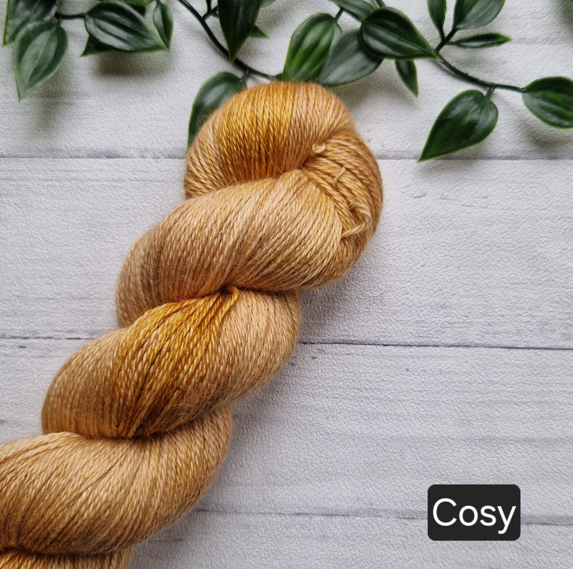 400 meters per 100g - 4ply This yarn is the perfect combination of silk, cashmere, and superwash merino, resulting in a beautiful, shiny texture that's soft to the touch. Get ready for a cosy, comfortable feel with a dash of added glamour. Thanks to the silk, this yarn will keep you cool in the summer months while providing warmth during the winter. Dyed to Order only - please get in touch. |