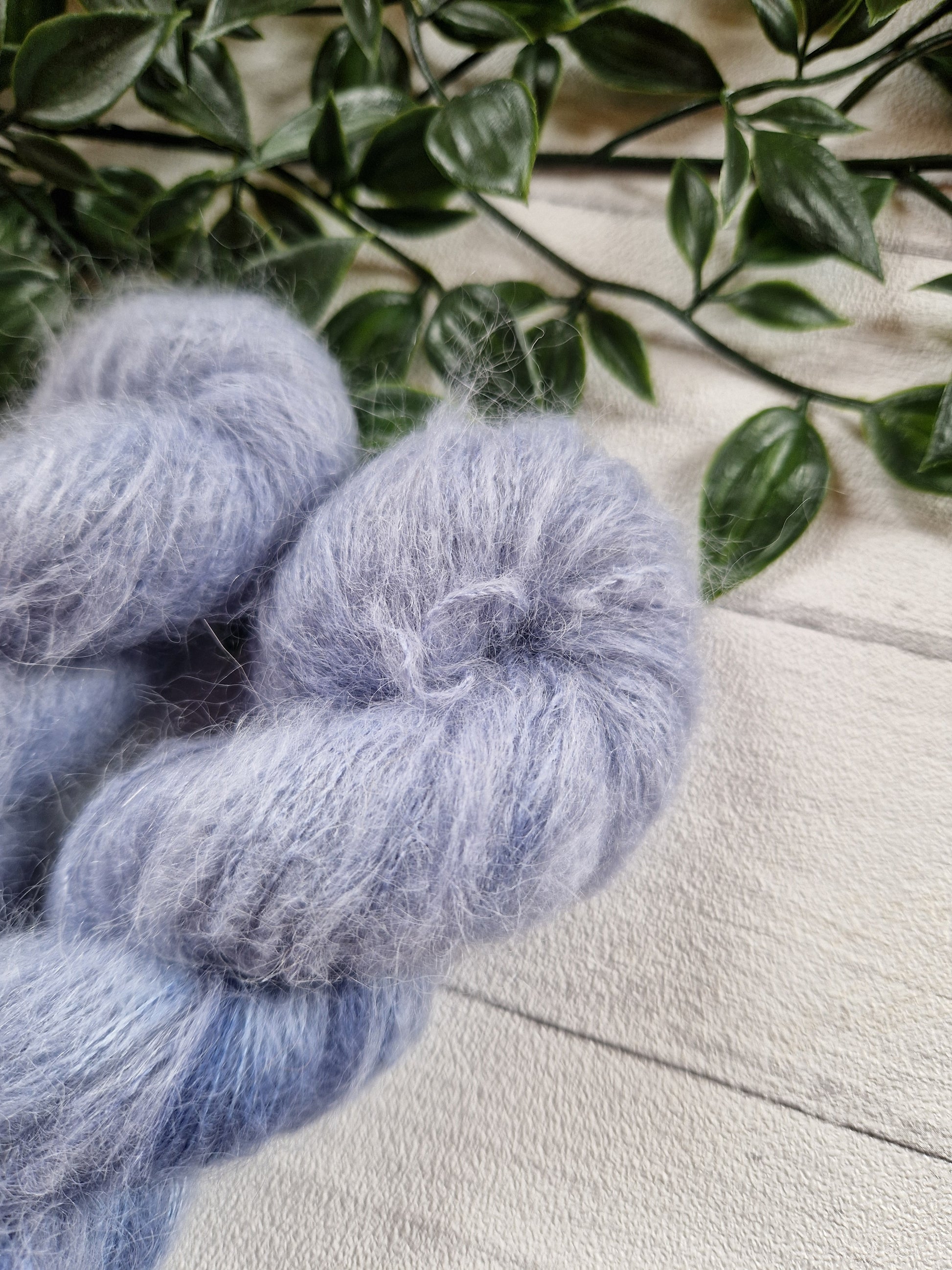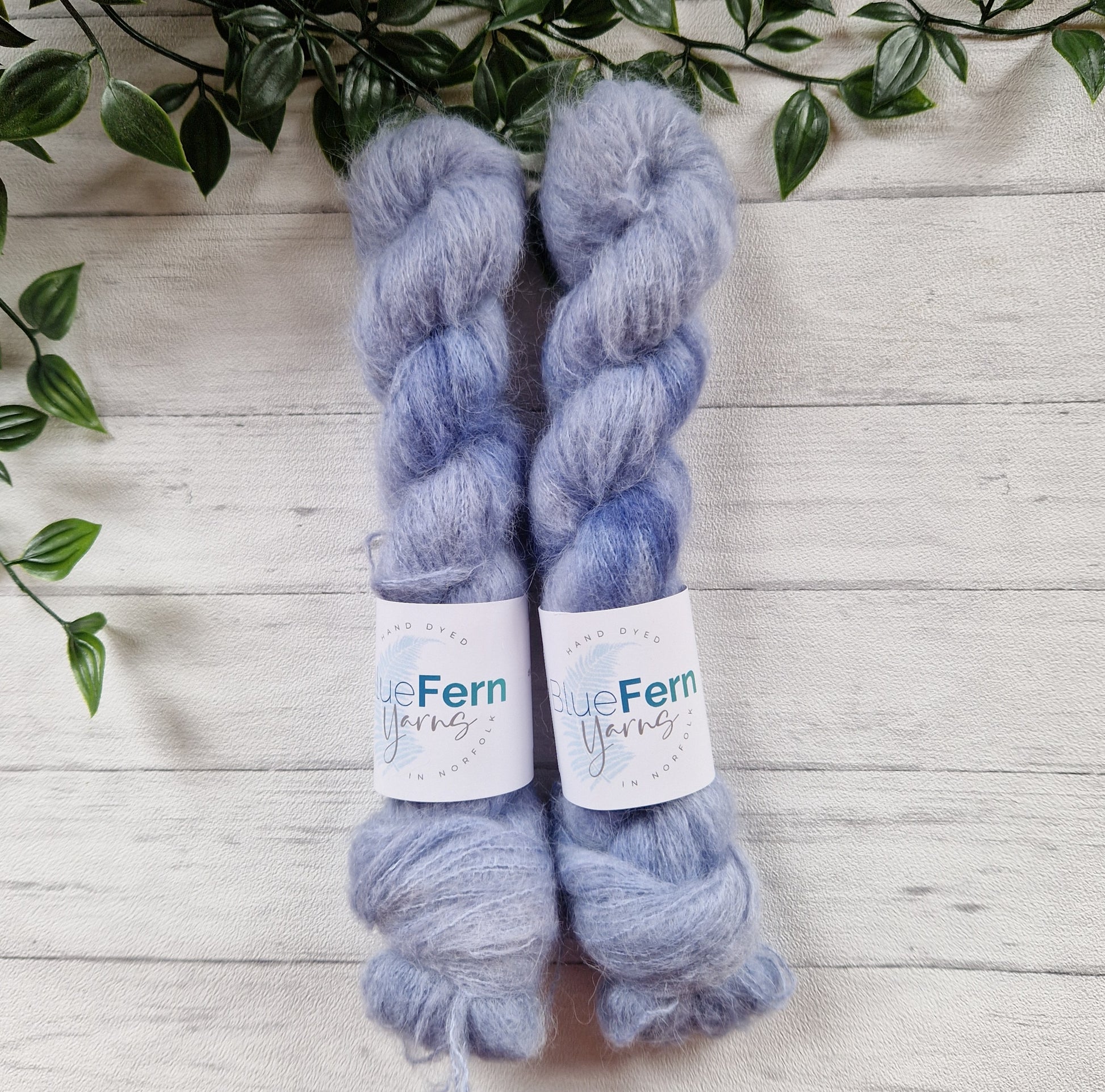 300 meters per 50g - Lace Weight This soft fluffy cloud-like yarn is super soft with a delicate halo ideal for holding with other yarn bases to create warm shawls and garments. It can also be used on its own. The way the fibres take up the dye is to create a really soft palette and the speckles will spread. This is a non-superwash yarn and therefore recommend handwashing only. |