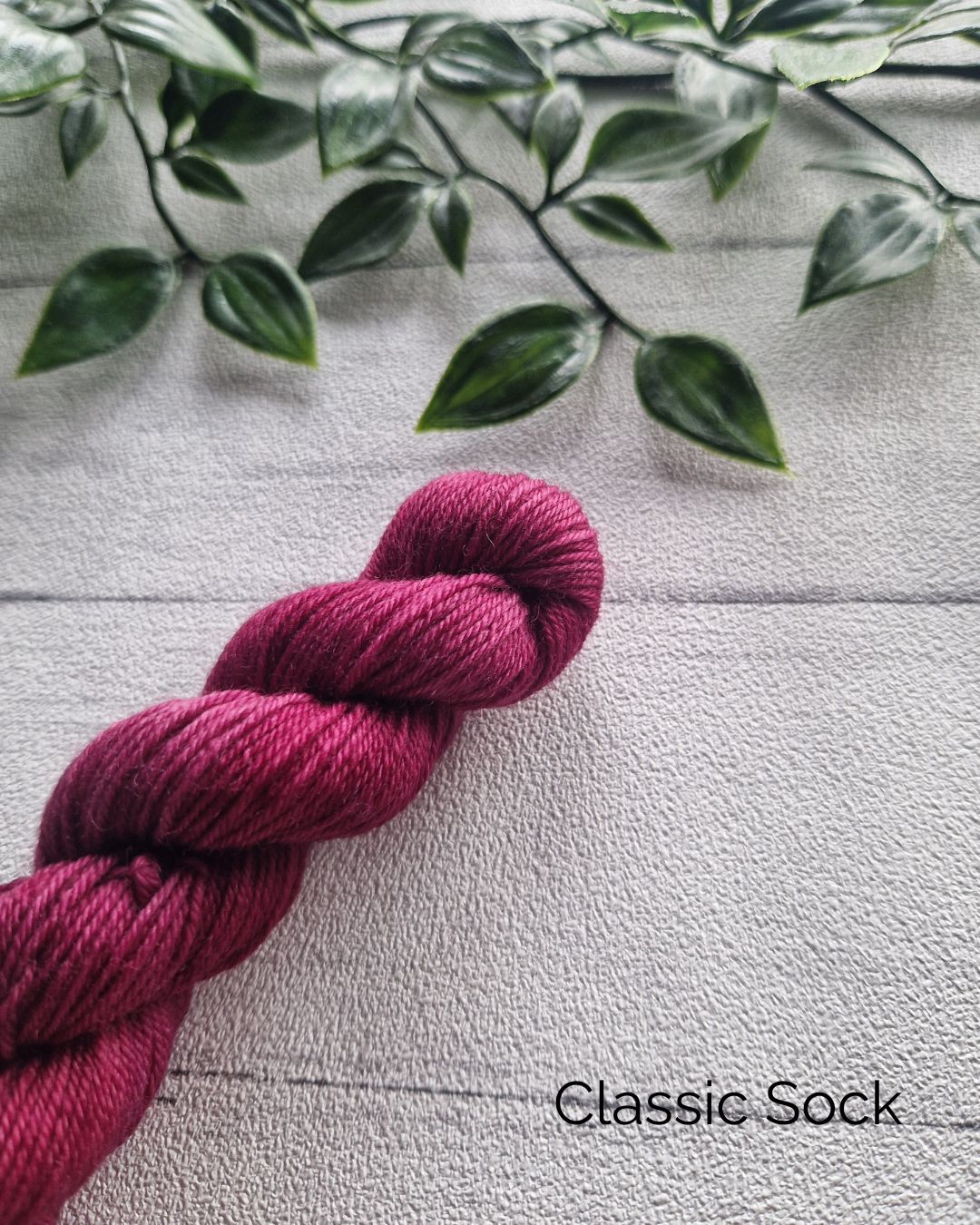 300m per 100g - Sport This popular yarn blend can be founs in may different dyed yarns and weights. It is a blend of Superwash Merino wool and Nylon, resulting in a soft yet strong texture that's perfect for knitting socks. Dyed to Order only - please get in touch. |