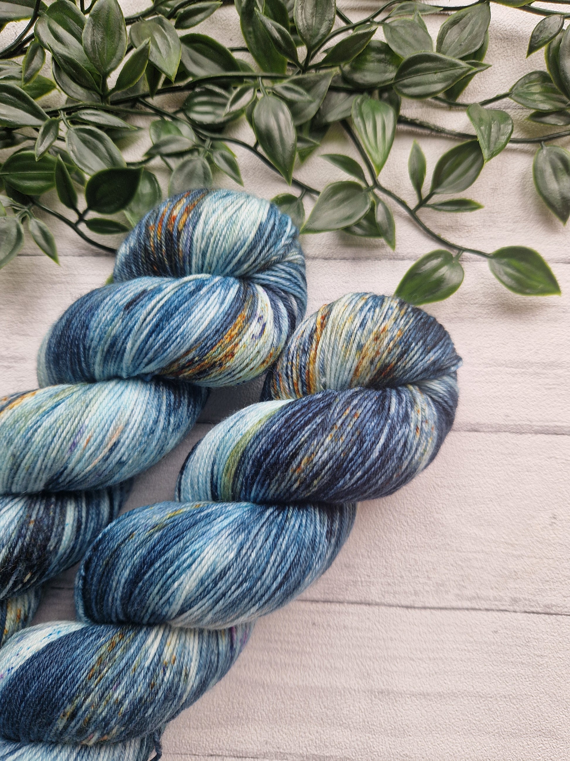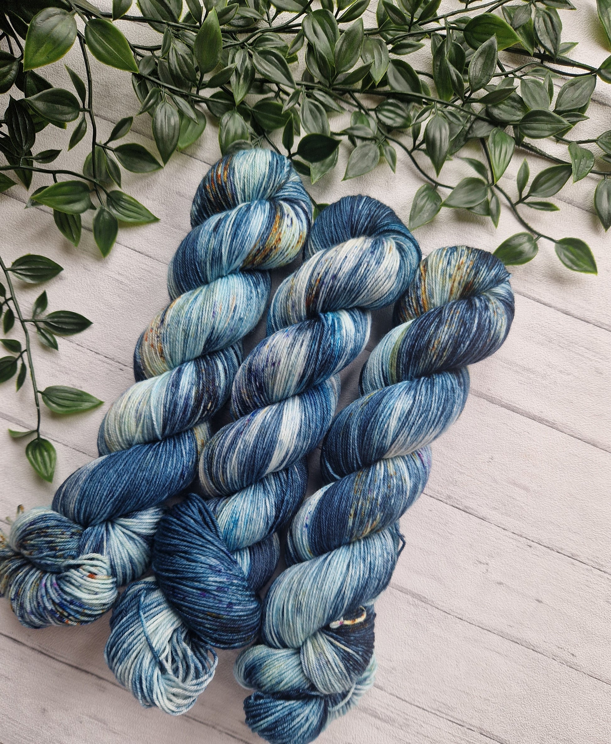 Equinox is a mix of blues with layers of darker ink blues on top. There is also a small pop over yellow speckles or blue speckles throughout the yarn.