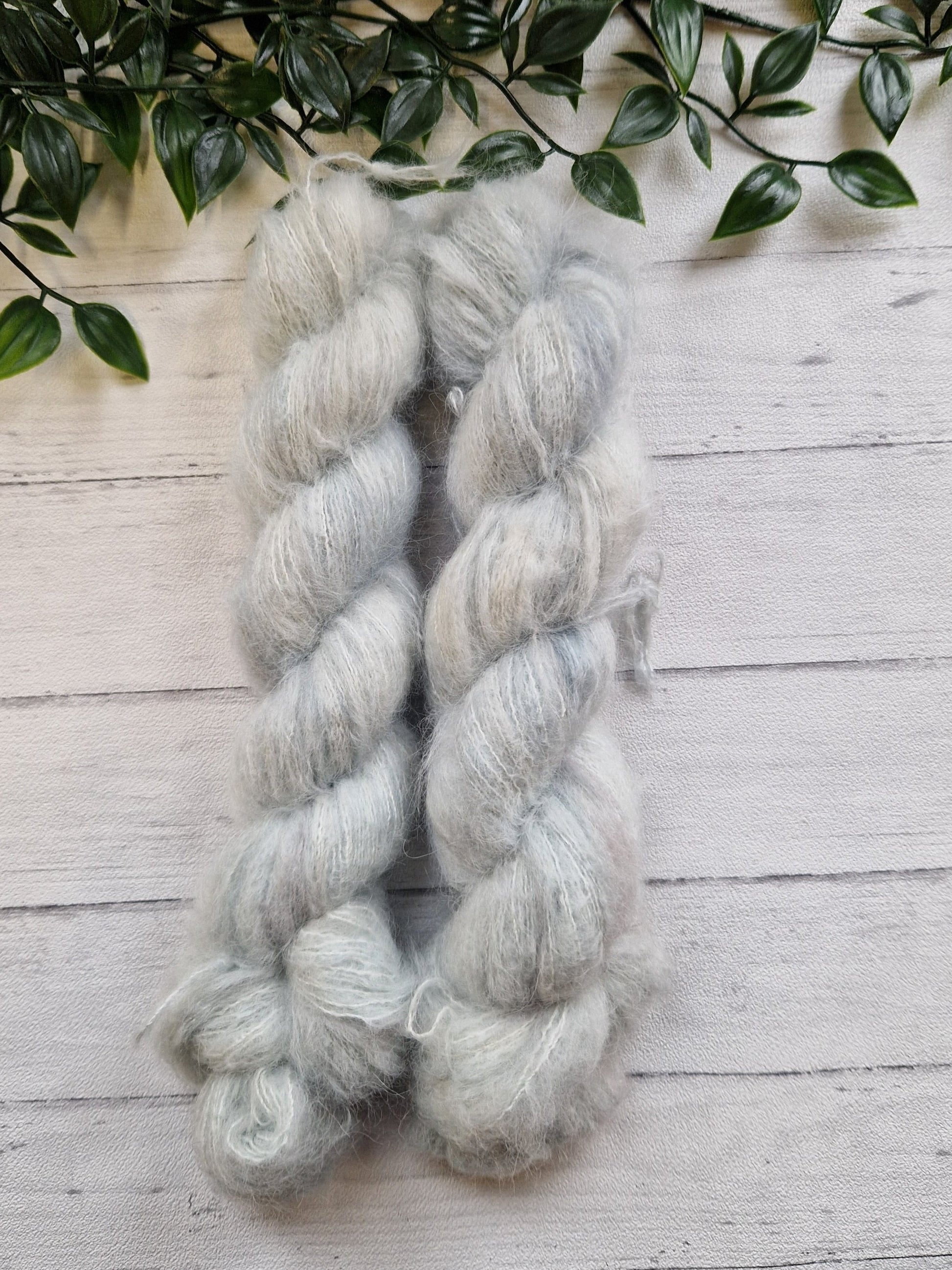 300 meters per 50g - Lace Weight This soft fluffy cloud-like yarn is super soft with a delicate halo ideal for holding with other yarn bases to create warm shawls and garments. It can also be used on its own. The way the fibres take up the dye is to create a really soft palette and the speckles will spread. This is a non-superwash yarn and therefore recommend handwashing only. |
