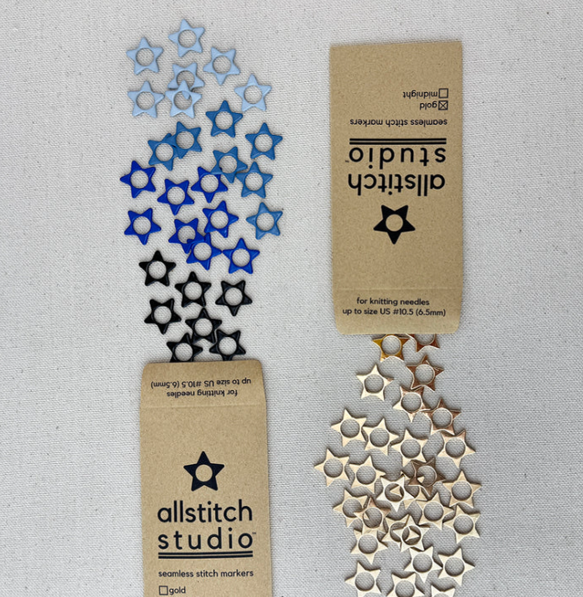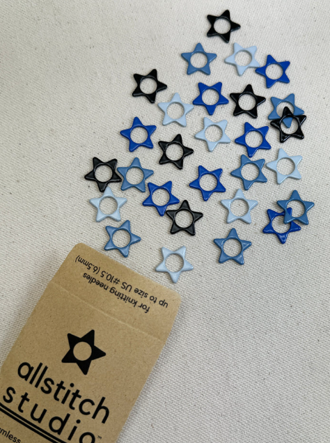 Midnight Stars: metal stitch markers with enamel coating in shades of black, blue, and slate grey.
