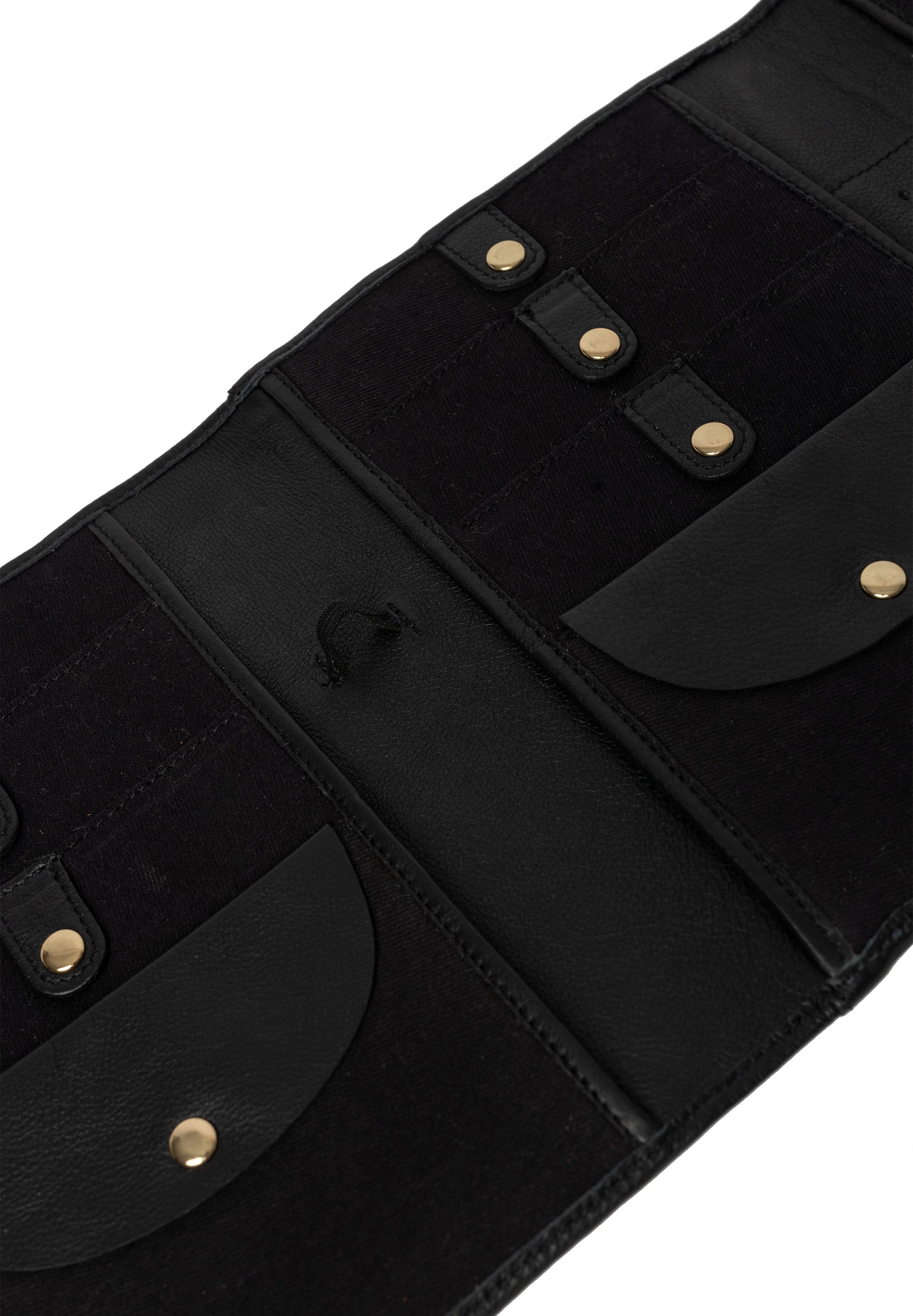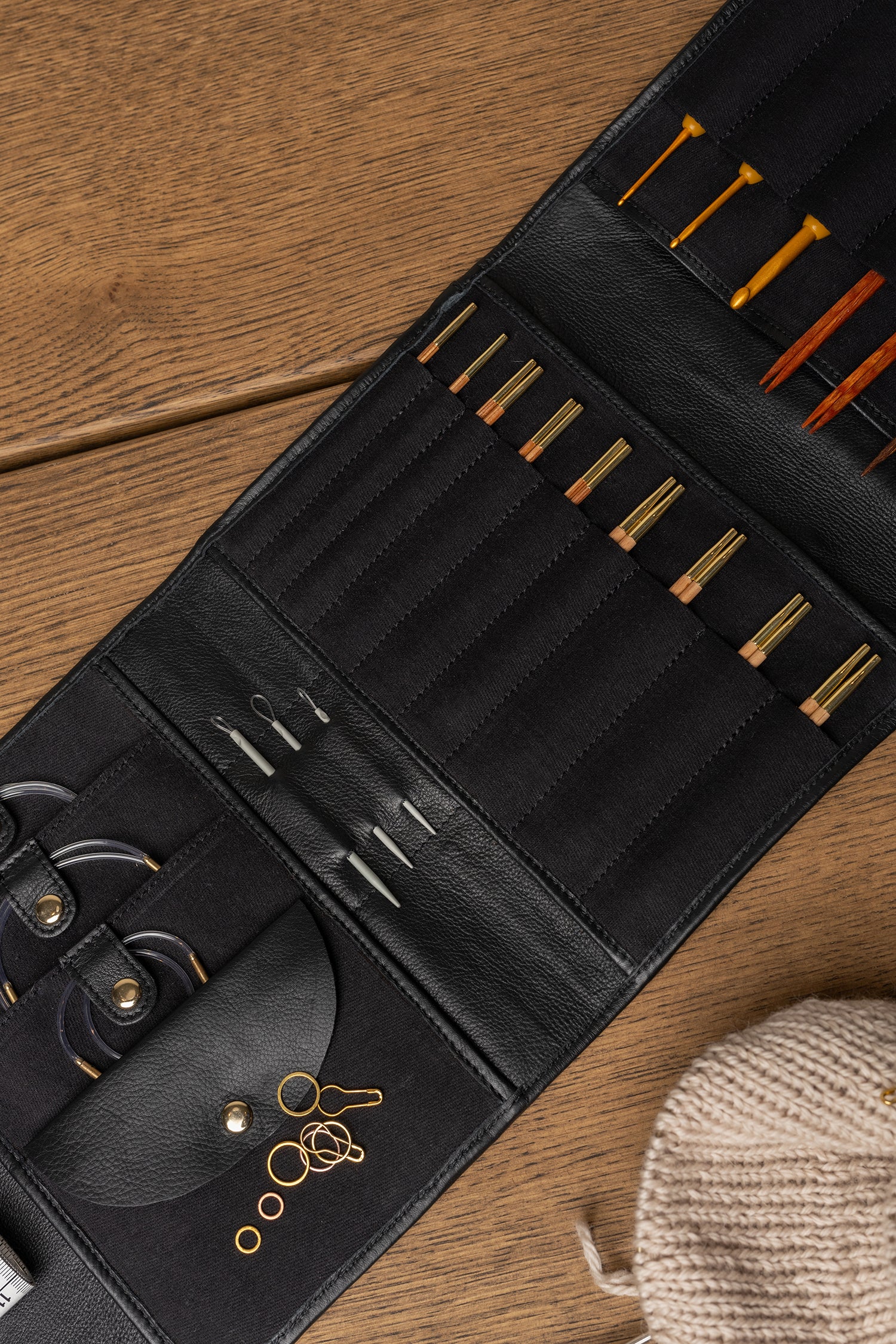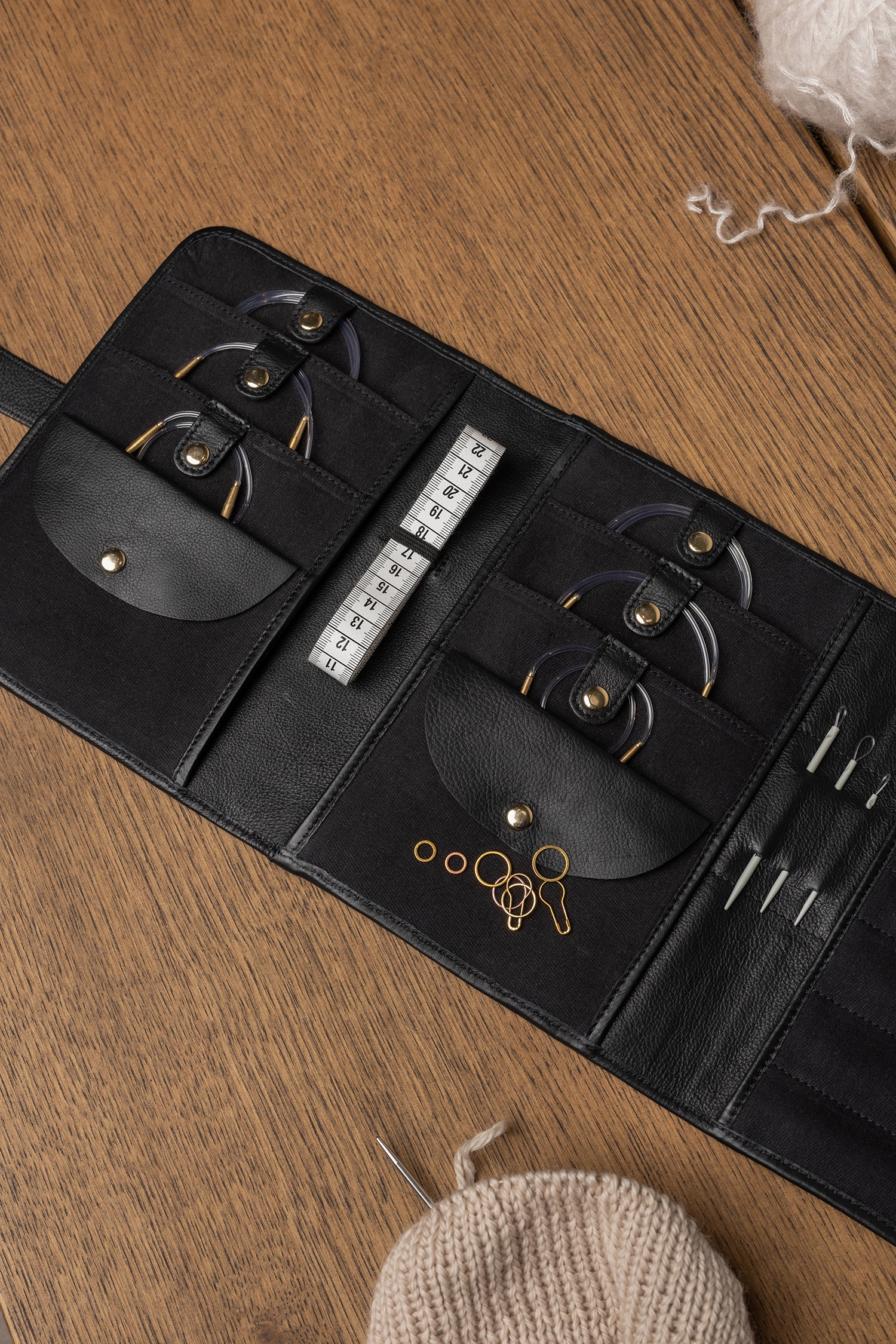PROJECT 14 is our XL needle case for organizing your interchangeable circular knitting needles. It features 6 pockets with snap closures to securely hold your wires. Behind these pockets, there are open compartments where you can store knitting patterns or similar items. An elastic band allows you to keep your measuring tape handy, and there are 6 holes in the leather to accommodate 3 needles. A total of 18 slim pockets for knitting tips, crochet hooks of stocking needles, keeps them organized. Finally, you have 2 small pockets with flap and button closure where you can store your scissor and other loose knitting accessories. The entire needle case elegantly folds together and fastens with a snap, making it easy to carry your essential knitting tools.