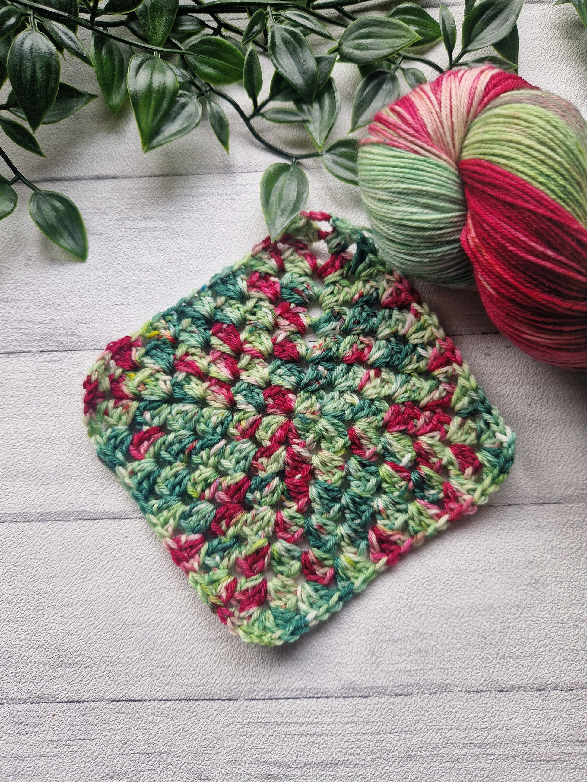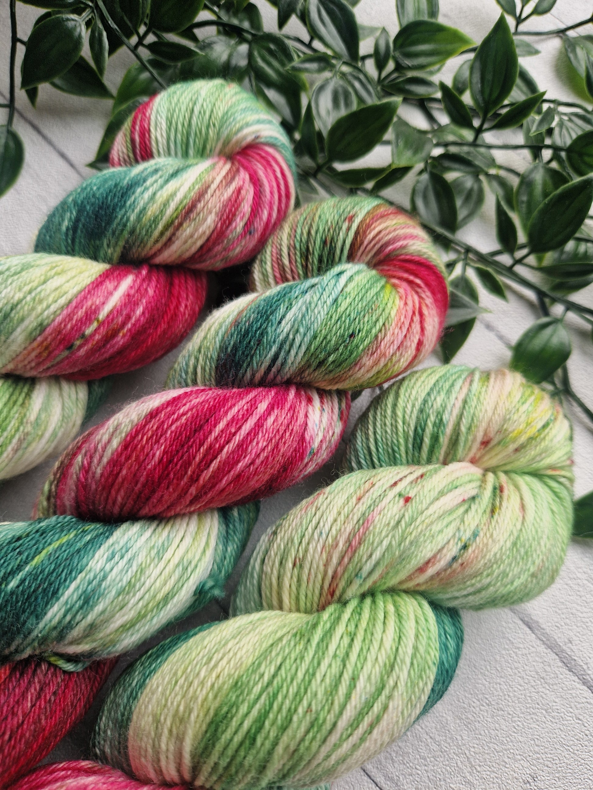 This pretty mix of bright and dark greens with a pop of Red is such a pretty mix of yarn.