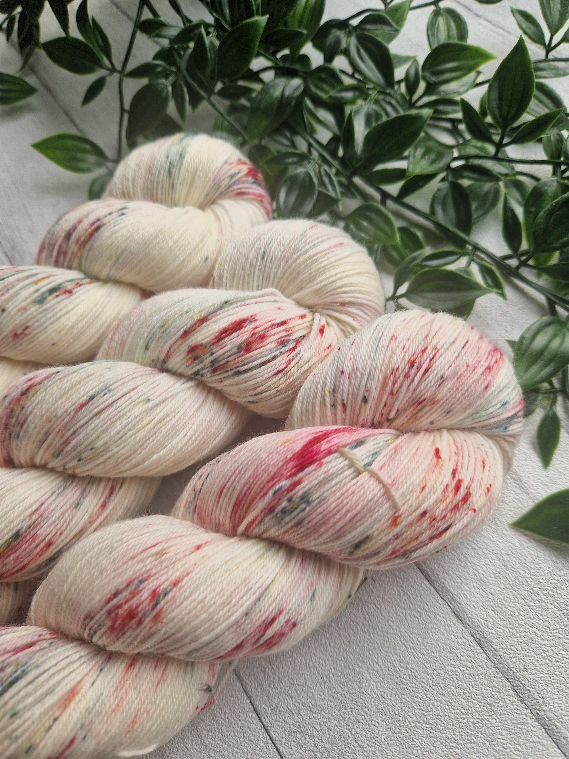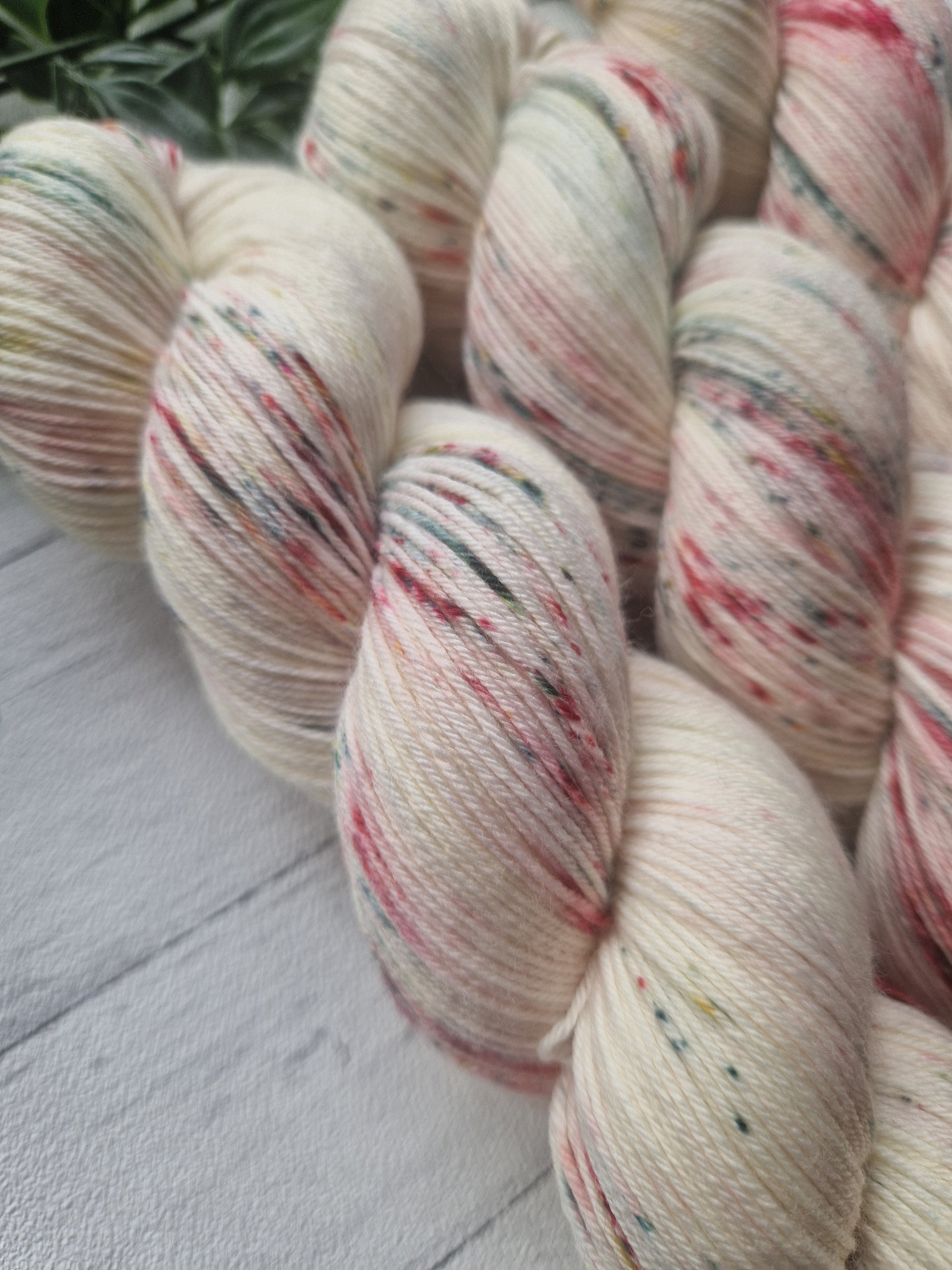 Bring the magic of winter into your projects with Snow Berries, a hand-dyed yarn inspired by frosted mornings and holly-laden hedgerows. The soft white base is sprinkled with cheerful green and red speckles, creating a playful yet elegant look. Each skein is dyed in small batches, ensuring unique variations that make your work truly one-of-a-kind.