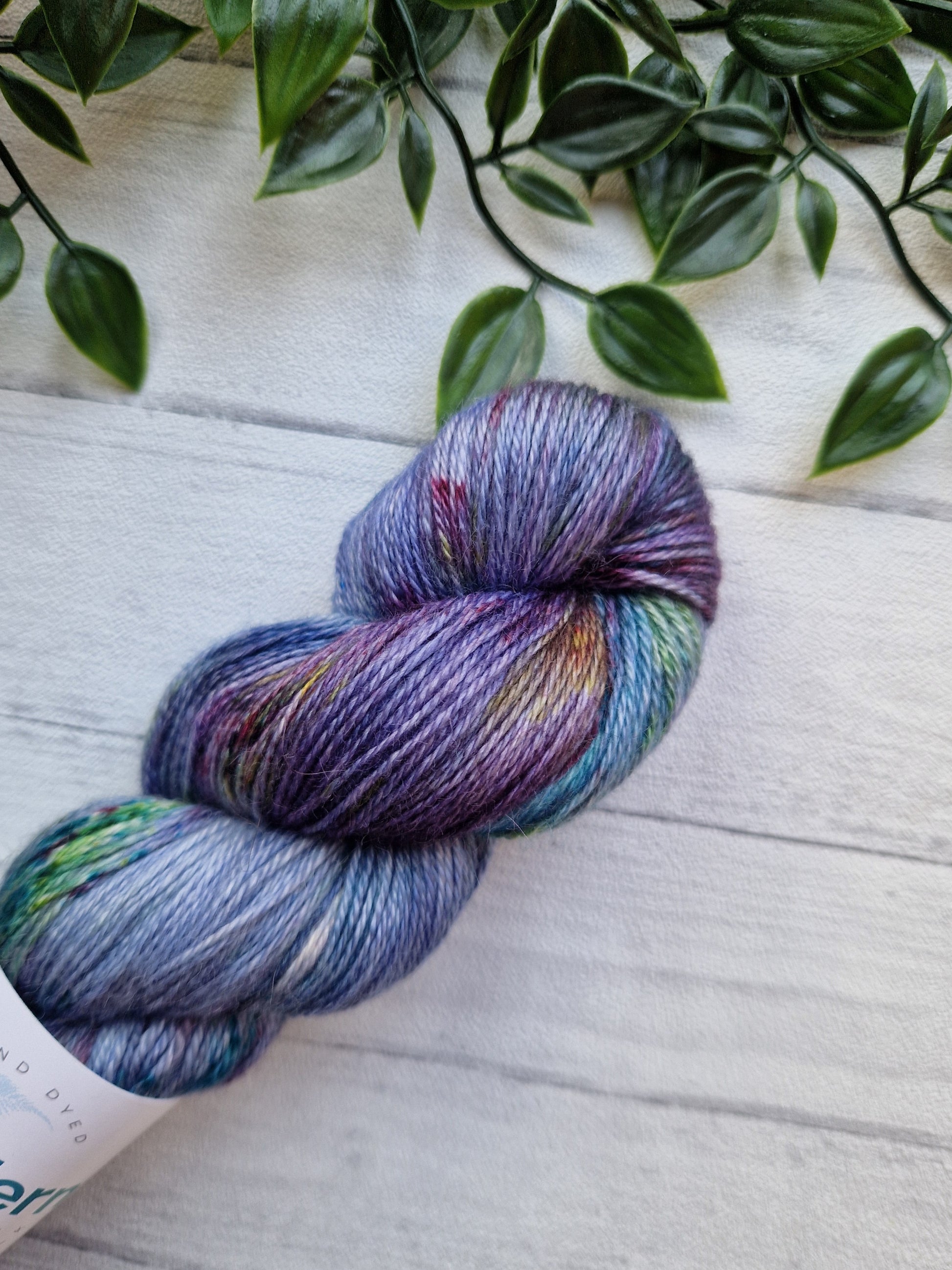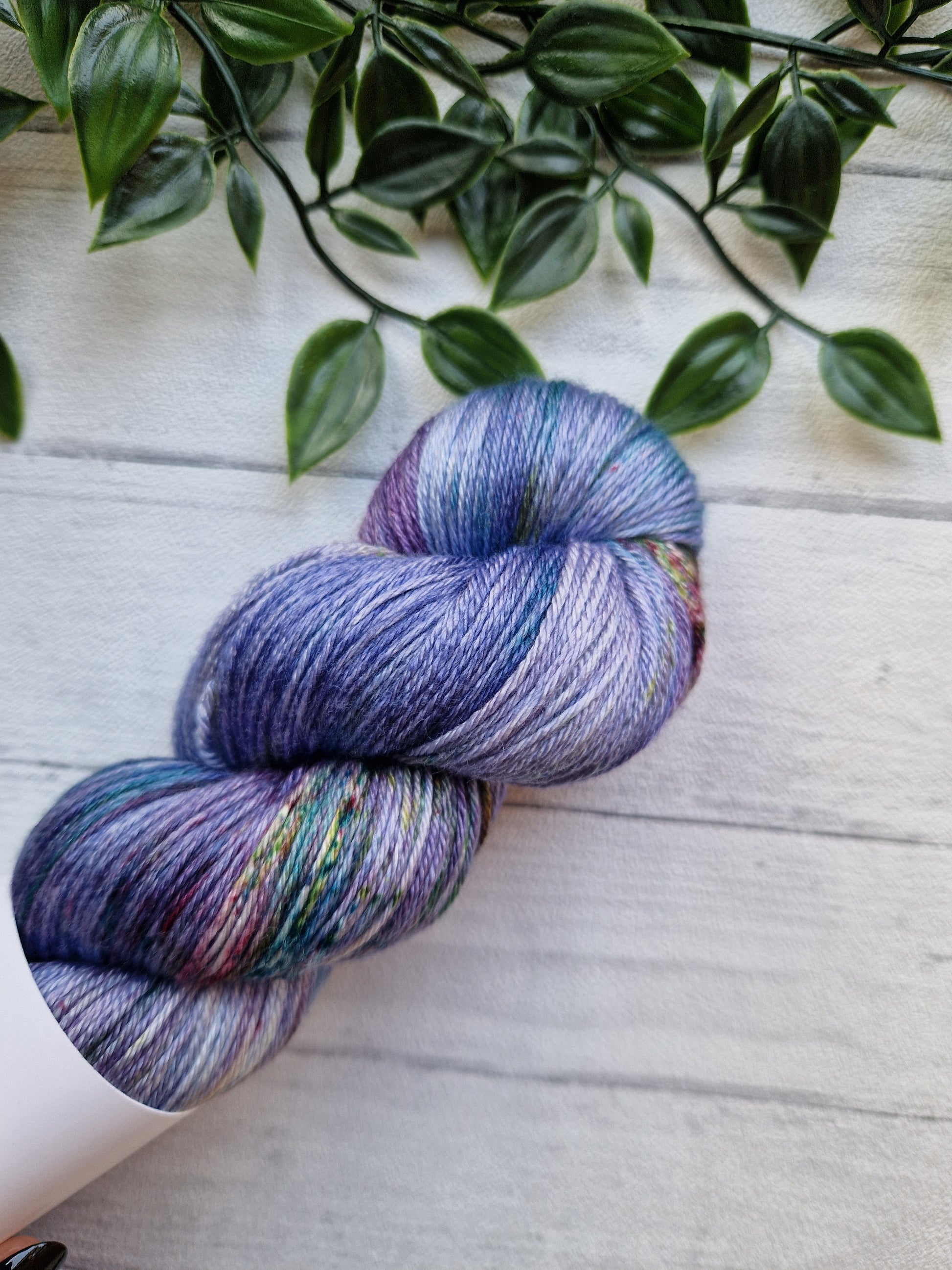 Spill the Tea is a stunning yarn hand dyed yarn with a mix of blues, purples and greens with brighter speckle pops.
