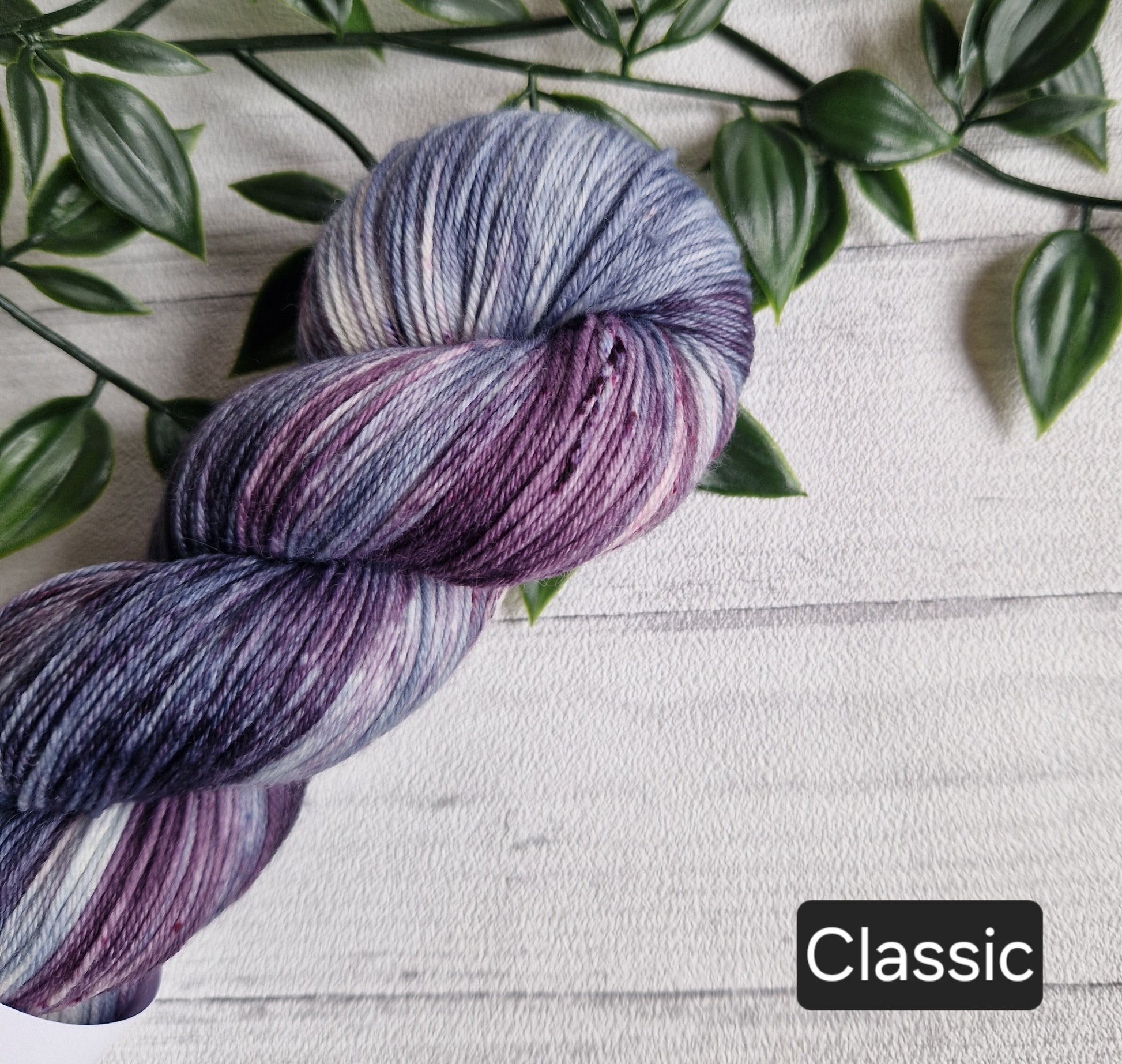 300m per 100g - Sport This popular yarn blend can be founs in may different dyed yarns and weights. It is a blend of Superwash Merino wool and Nylon, resulting in a soft yet strong texture that's perfect for knitting socks. Dyed to Order only - please get in touch. |