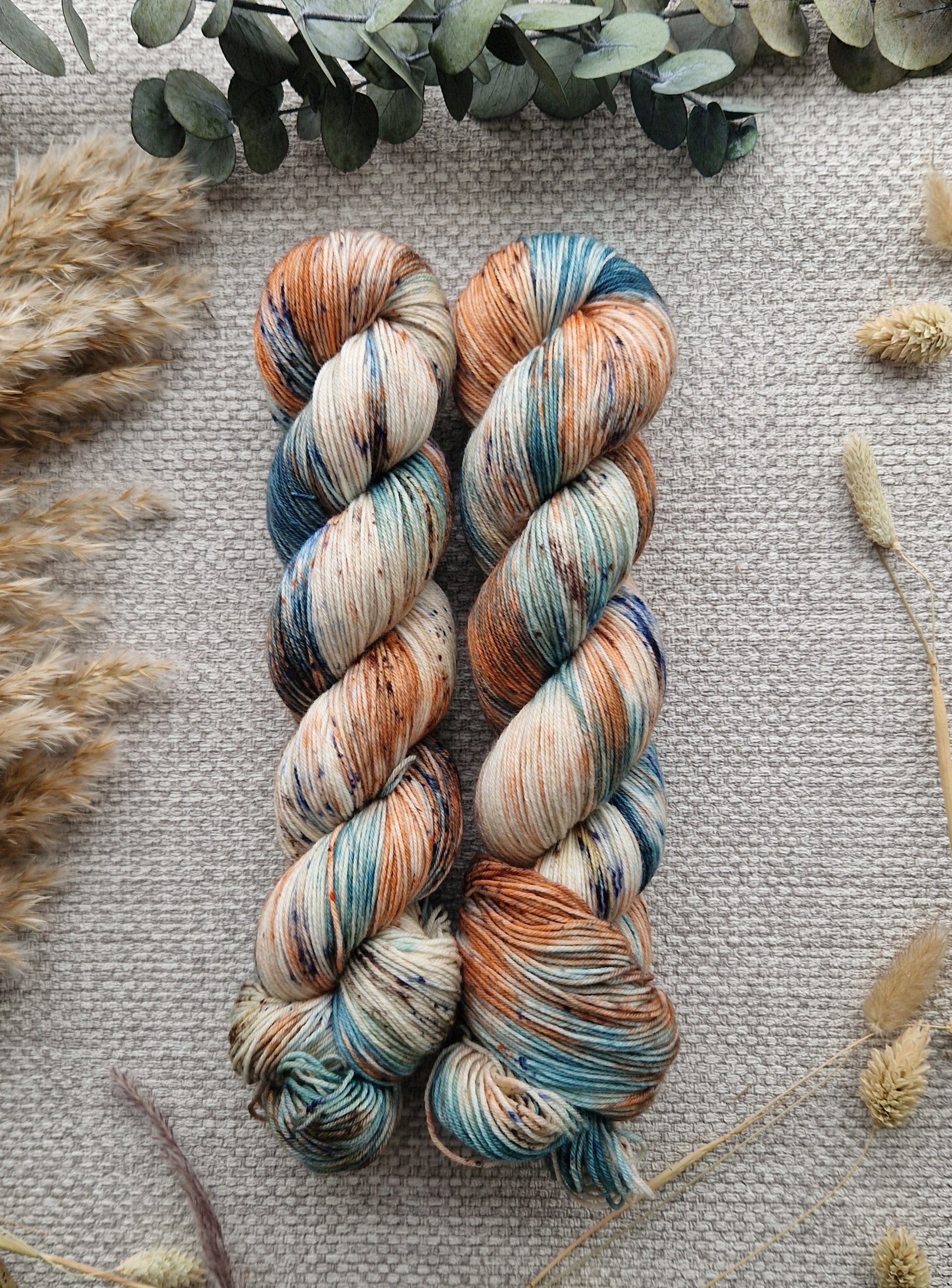 300m per 100g - Sport This popular yarn blend can be founs in may different dyed yarns and weights. It is a blend of Superwash Merino wool and Nylon, resulting in a soft yet strong texture that's perfect for knitting socks. Dyed to Order only - please get in touch. |