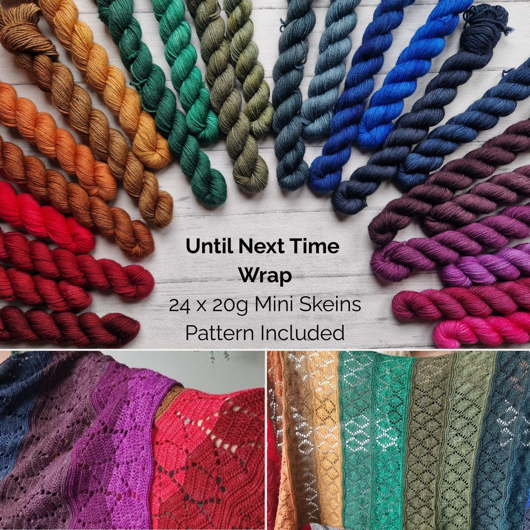 This includes 12 x 20g Classic Sock skeins and 12 x 20g Yak 4ply skeins plus two printed patterns for the Until Next Time Wrap, one knit and one Crochet.
